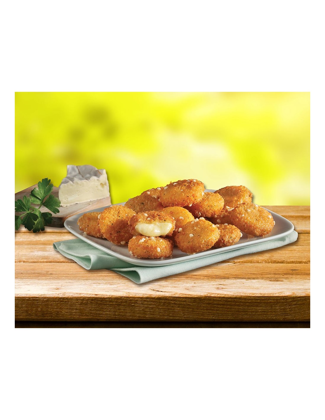 Cheese spread preparation (50 %) [cheese, camembert, water, butter, milk protein, emulsifying salts: polyphosphates, doium citrates, maize starch, salt], bread crumbs [24 %] (wheat flour, rice flour, salt, yeast, parsley, emulsifier: lecithins, stabiliser: calcium carbonate, barley malt extract, sugar), sunflower oil, water, wheat flour, raising agent: sodium carbonates.